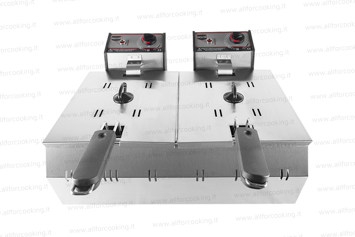 La nostra friggitrice elettrica doppia vasca è costituita da una robusta struttura in acciaio inox con piano di lavoro e vasche stampate in acciaio inox spessore 15/10. Pensata per un uso professionale, per ristornati, bar, paninoteche, truck food, garantisce la possibilità di preparare una grande quantità di prodotti occupando poco spazio. Dotata di doppia vasca 5 + 5 lt, cestelli e coperchi sempre in acciaio inox.