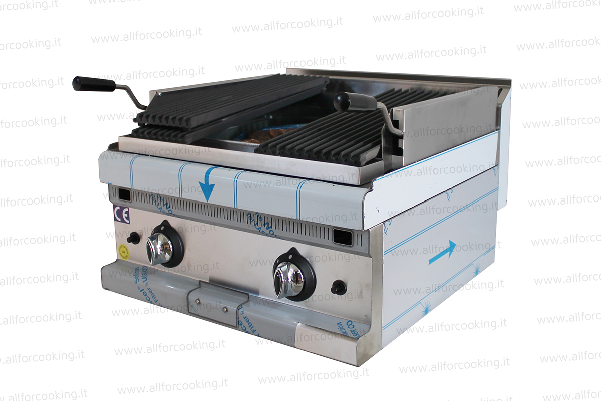 La griglia in ghisa è dotata di 2 zone di cottura indipendenti, ognuna regolata dal proprio termostato, con manici in plastica termoisolante che permettono di poterle agevolmente spostare e/o posizionare. Al di sotto delle griglie in ghisa è posizionata la pietra lavica (prodotto naturale, resistente agli urti, alle abrasioni, al calore e al gelo). Durante la cottura è necessario disporre la pietra lavica in modo uniforme sotto ciascun braciere.